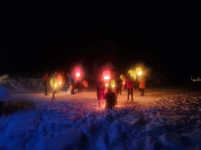 Draußen an der Feuertonne nehmen wir anschließend eine gemeinsame Mahlzeit zu uns, bevor am Nachmittag die Hunde versorgt werden. Heute Abend laden wir euch zu einem großen Raclette Essen ein mit sehr vielfältiger Auswahl und vielen landestypischen Leckereien. So feiern und stoßen wir gemeinsam auf das Neue Jahr an. Um Mitternacht wird wieder angestoßen und wir lassen draußen schwebende Lampions zum Himmel steigen und hoffen, dass unsere Wünsche in Erfüllung gehen.
